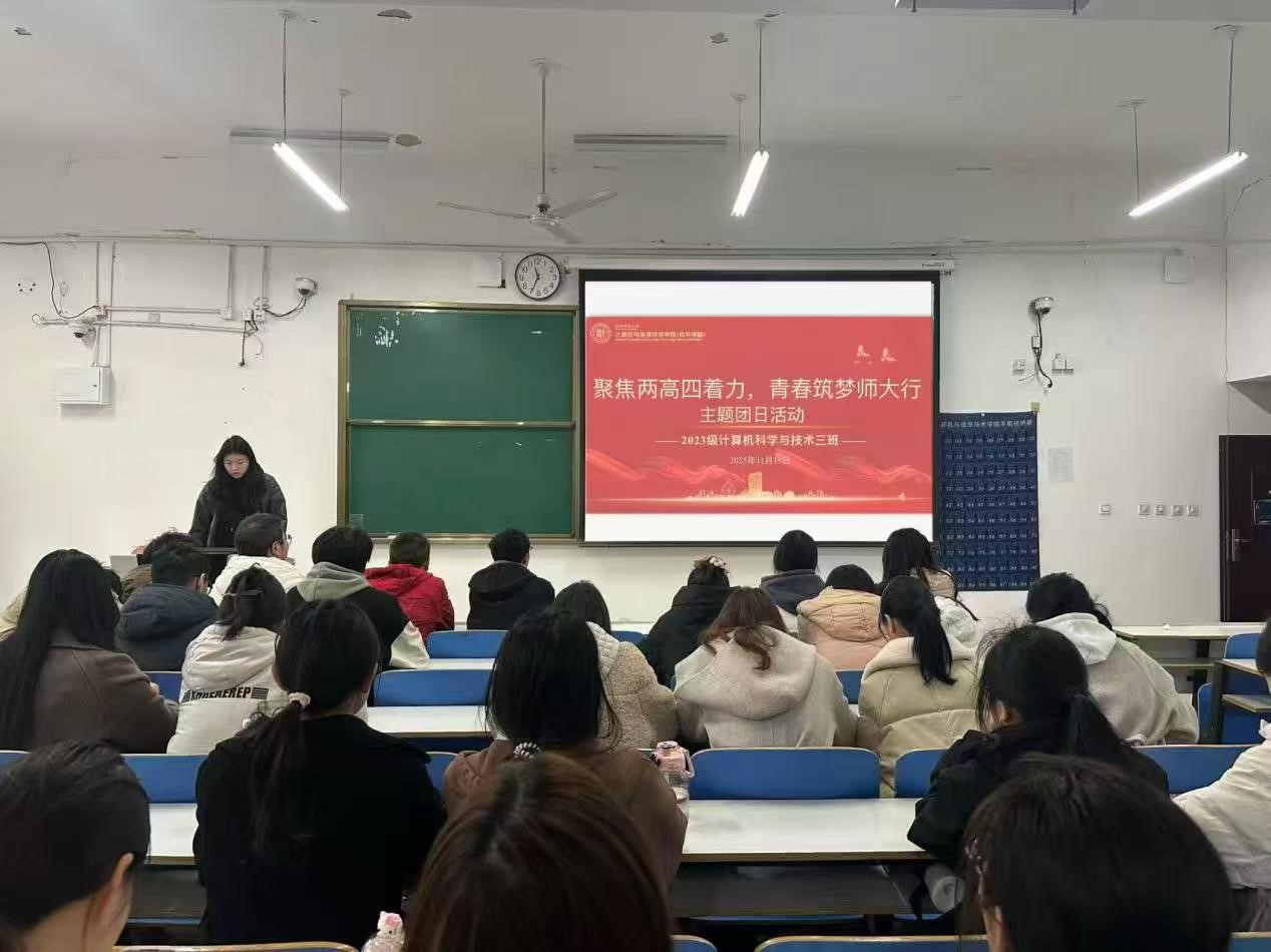 为深入学习领会“两高四着力”精神内涵,引导青年学生坚定理想信念、矢志拼搏奋斗,11月16日晚上,我集团2023级计算机科学与技术三班于计科楼101教室开展“聚焦两高四着力,青春筑梦师大行”主题团课。本次团课由团支书赵诗涵主持。